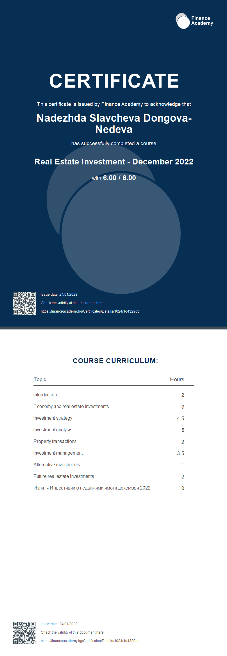Сертификат - Real Estate Investment - December 2022 - Finance Academy