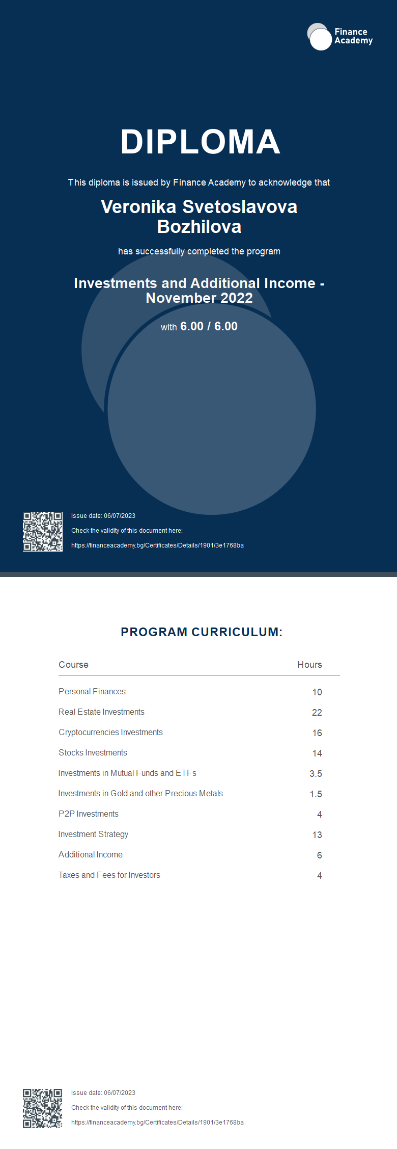 Диплома - Investments and Additional Income - November 2022 - Finance Academy