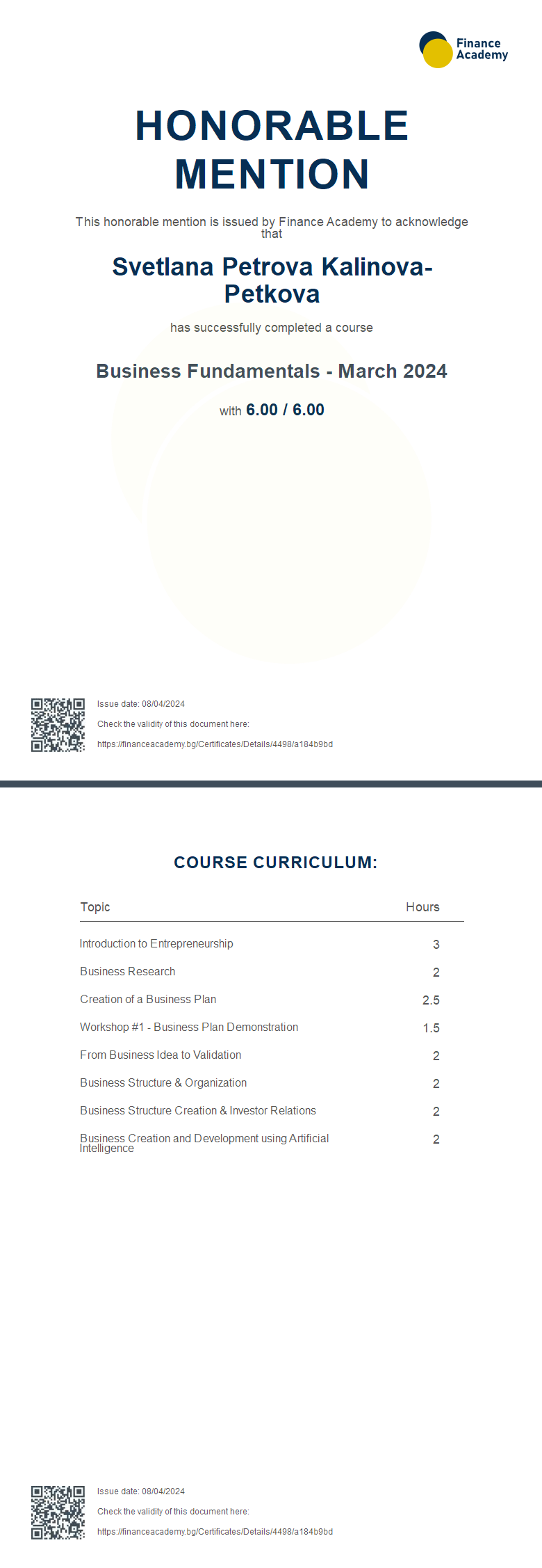 This honorable mention is issued by Finance Academy to acknowledge that