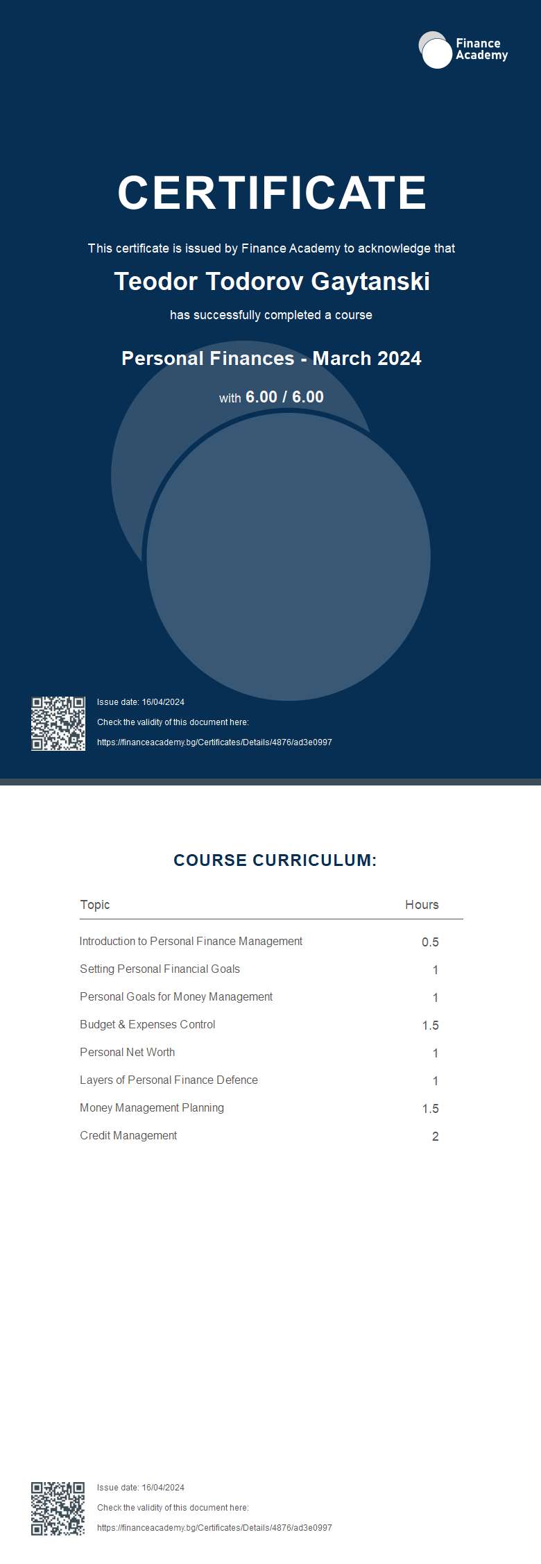 This certificate is issued by Finance Academy to acknowledge that