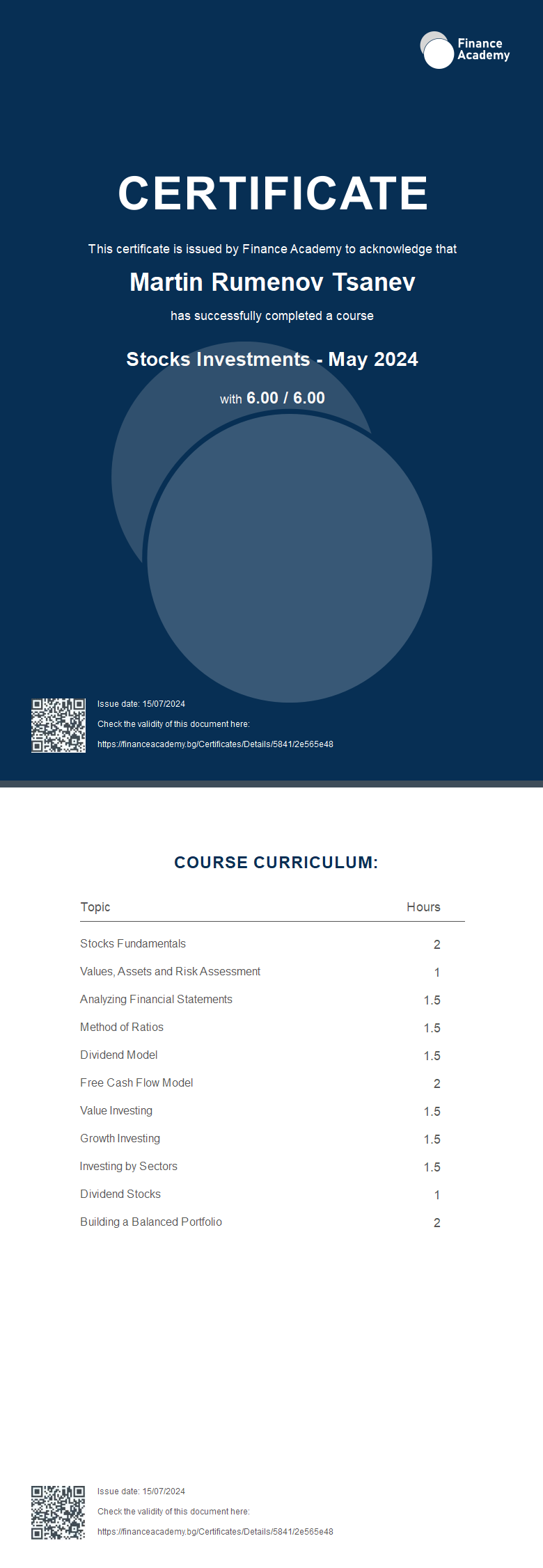 This certificate is issued by Finance Academy to acknowledge that