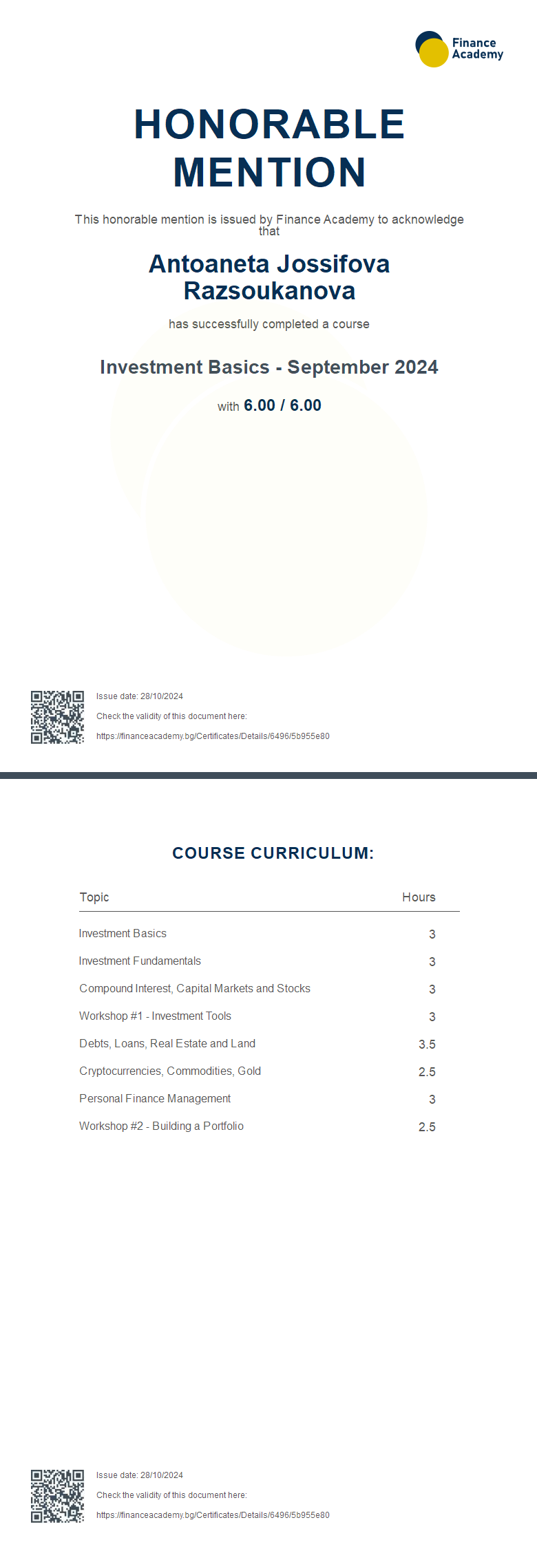 This honorable mention is issued by Finance Academy to acknowledge that